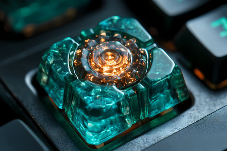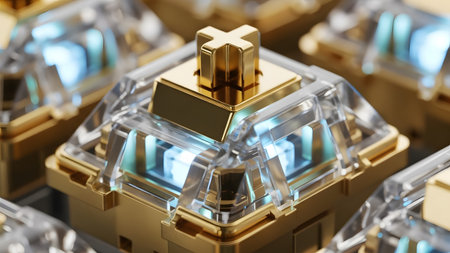 Close-up view of a luxurious gold and clear mechanical keyboard switch with blue led illumination
