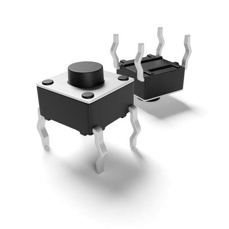 Tactile tact button micro switch DIP electronic component isolated on white background. 3D rendering illustration.