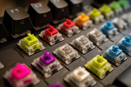 selected focus, narrow depth of blue switch with disassembled mechanical keyboard game.