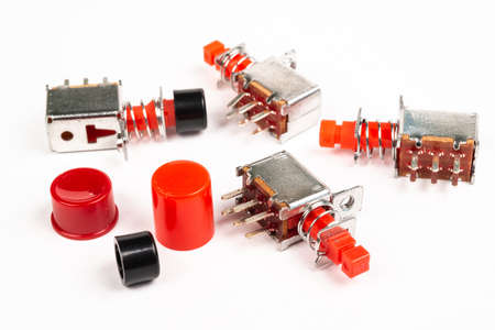 red electronic buttons on white background. drive element of pushbuttons and switches