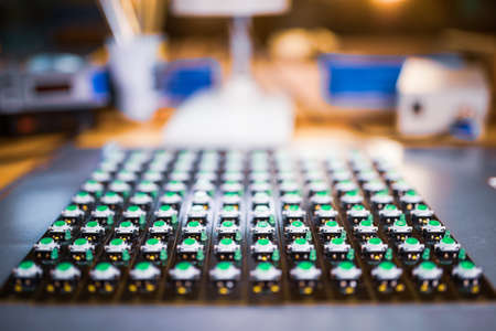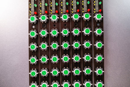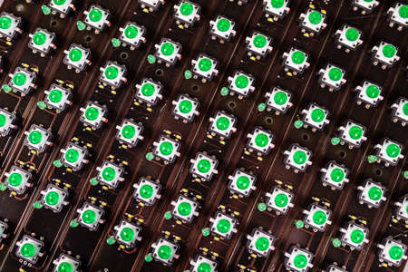 Close-up of a LED panel of green light indicators is in the production. The concept of industrial production of equipment for military and strategic purposes