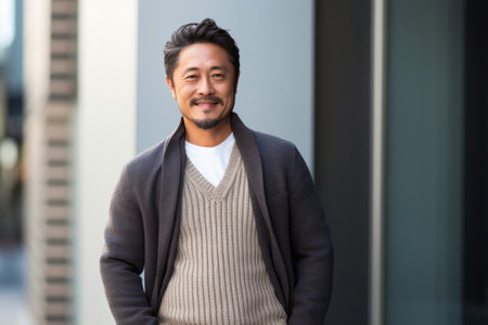 Portrait of mature Asian man in the city streets. Looking at camera.