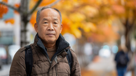 Mature Asian man stands seriously on a vibrant street filled with autumn foliage