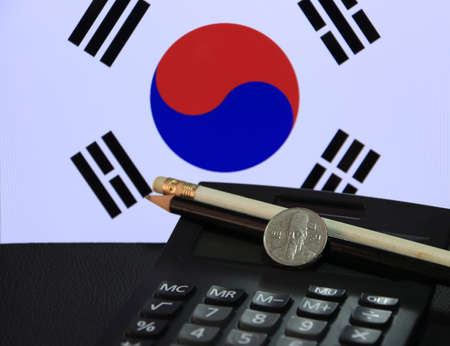 One hundred Korean won coin on obverse, (KRW) on black calculator with black and white pencil