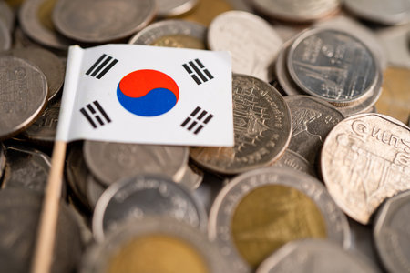 Stack of coins with Korea flag on white background.