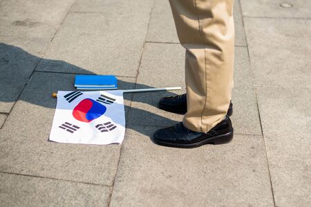 Korean men stand next to Korea flag on the floor.