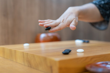 hand putting baduk black stone on wooden grid board - an ancient game also known as baduk in Korean, weiqi in Chinese and Igo in Japanese