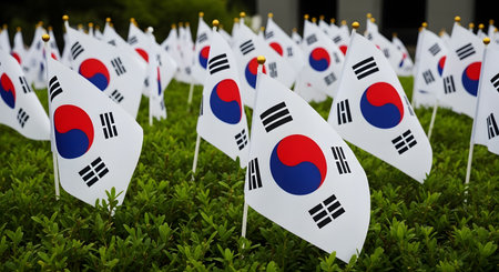 South Korea flags on semiconductor microchips. South Korea is a key market in the global semiconductor industry