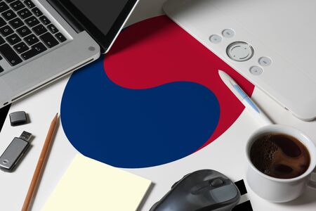 South Korea national flag on top view work space of creative designer with laptop, computer keyboard, usb drive, graphic tablet, coffee cup, mouse on wooden table.