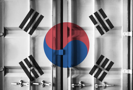 Shipping container with South Korea national flag overlay symbolising tariffs and international trade policies in global commerce context