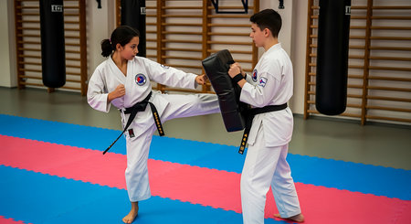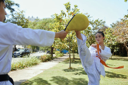Practicing taekwondo with durable kick pad targets, martial arts concept