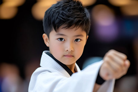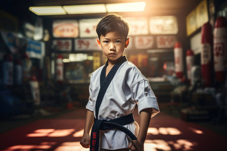 Portrait of a focused young boy practicing karate in his dojo