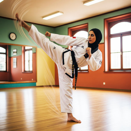 Young muslim woman practicing taekwondo in the gym.