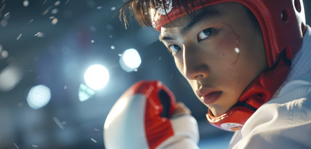Close-up of an Asian kickboxer. A man in a red and white boxing glove and a protective helmet is preparing to strike. The concept of determination and focus