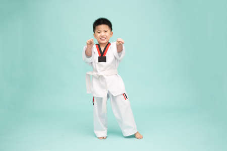 Asian boy in a taekwondo suit doing martial arts moves isolated on green background, 3 years old