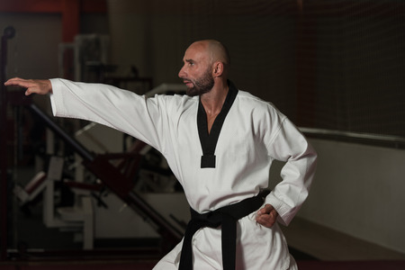 Young sporty man in white kimono training karate kata moves in gym