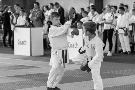 Odessa, Ukraine - September 30, 2019: Karate Championship among children of athletes. Best karate fighters children demonstrate their ability to fight on tatami. Battle of karate. Children's sports