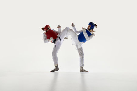 Female taekwondo fighters in red and blue protective gear in motion, fighting with synchronized kicks on white background.