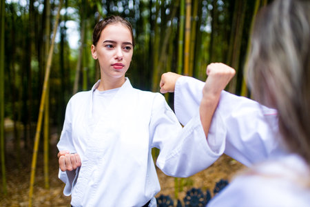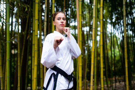 A young woman with a black belt coaches in martial art outdoor bamboo background