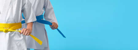 Little boys in karategi on light blue background with space for text