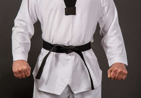 Close-up of a young man's Taekwondo uniform defensive posture