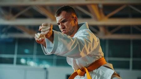 Karate man in fighting stance. Male karate fighter practices punches during karate training. Bearded man in white kimono with hands clenched in fist ready to fight. Karate man exercising combat sport.