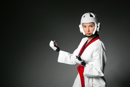 girl in kimono engaged taekwondo, studio shot