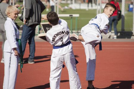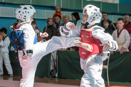 Orenburg, Russia - 23.04.2016: Taekwondo competitions among boys on Open Championship Orenburg city among boys and girls born between 2005-2007