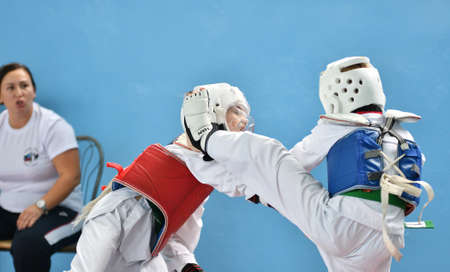 Orenburg, Russia - October 19, 2019: Boys compete in taekwondo (Korean martial arts) at Orenburg Open Taekwondo Championship