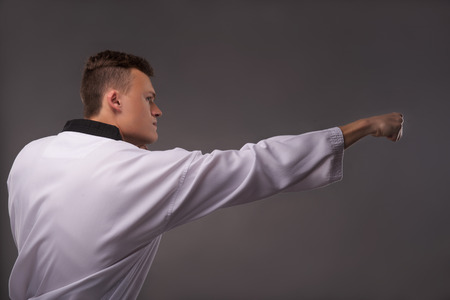 Young caucasian sportsman dressed in kimono practice in karate isolated over gray background