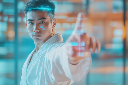 Young martial artist trains with intense focus while surrounded by a technologically advanced backdrop.