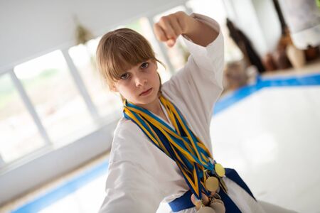 Girl loving aikido. Appealing serious blonde-haired girl loving aikido wearing medals on neck
