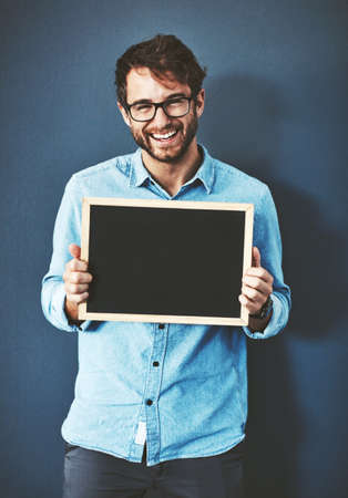 Im so excited to share this news with you. Studio portrait of a young man holding a blackboard against a grey background.