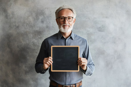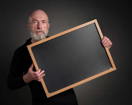 Senior man with gray beard and glasses holding a small empty chalkboard, smiling at camera against a gray background