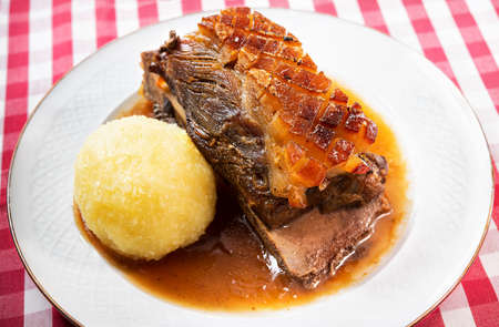 Appetizing Bavarian (Franconian) speciality. Roast pork shoulder with dumplings and dark beer sauce