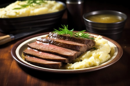 high-angle shot of brisket slices served with mashed potatoes, created with generative ai