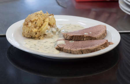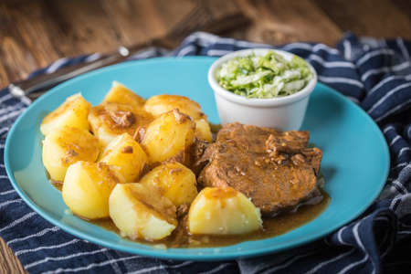 A plate of Sauerbraten, considered as the national food of Germany. meat, which is cooked slowly in the oven for hours and results in soft and tender meat that will give you an amazing culinary experience