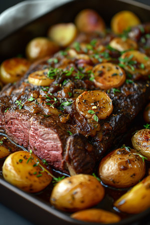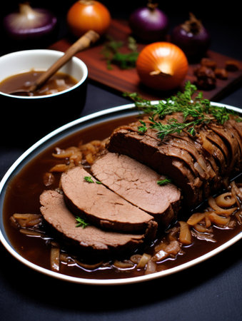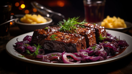 German Comfort: Tender Pot Roast Bursts with Tangy Flavor in Sauerbraten Feast. AI-generated