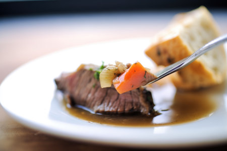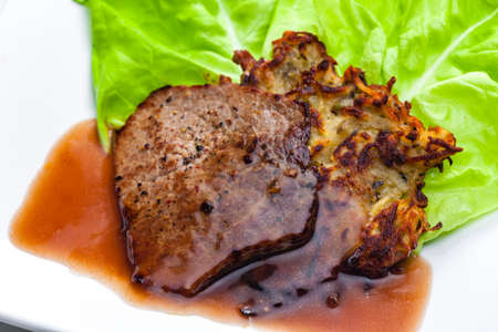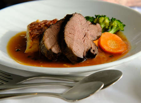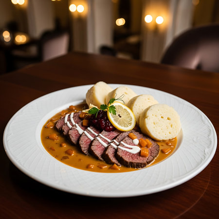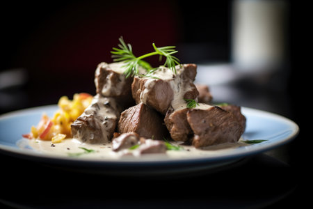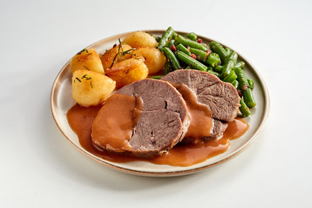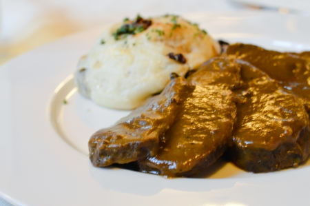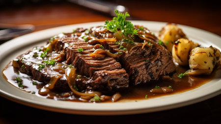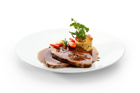 gourmet cuisine roast beef in traditional gravy sauce meal