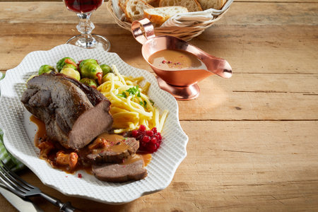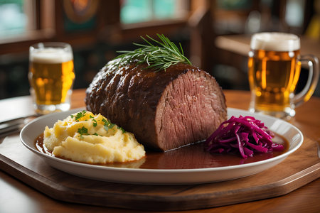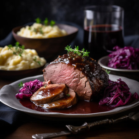 This mouthwatering dish features tender and juicy roast beef, marinated in vinegar, red wine, and spices, served with a side of tangy red cabbage and fluffy potato dumplings.