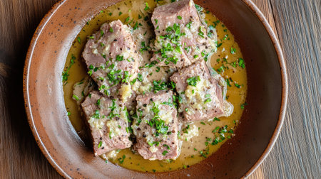 A beautifully presented plate of tender meat in savory sauce, garnished with fresh herbs. Perfect for gourmet dining and food photography.