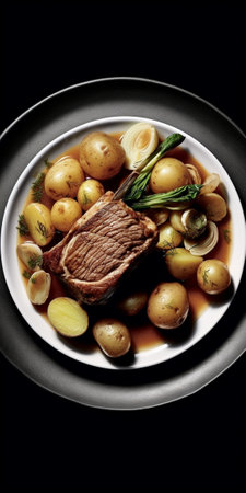 Generative AI : Roasted lamb leg with potato and green peas Black background Copy space Top view