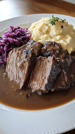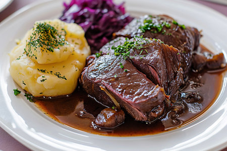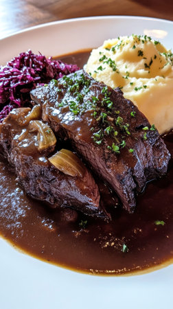Savory Sauerbraten garnished with herbs rests in a flavorful gravy, paired with smooth mashed potatoes and vibrant red cabbage in a warm dining atmosphere
