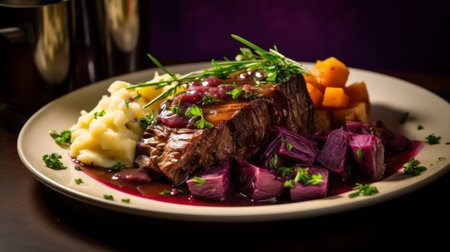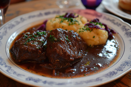 Rustic German Delight: Experience Sauerbraten's magic - tender, marinated roast nestled in a tangy sauce, complemented by the contrasting colors and textures of red cabbage and fluffy dumplings. AI-generated