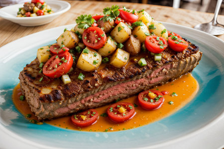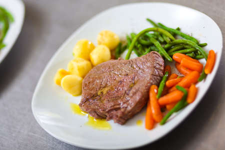 A beautifully arranged gourmet dish showcasing perfectly cooked beef alongside an array of vibrant vegetables for an upscale dining experience.