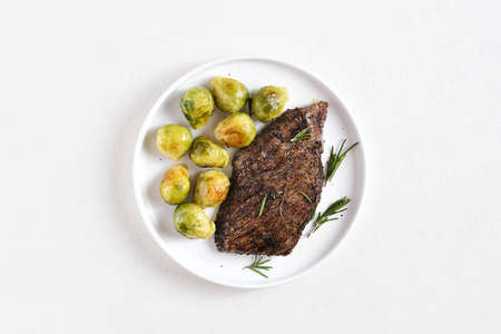 Grilled beef steak with brussels sprouts on plate over white background with free text space. Top view, flat lay