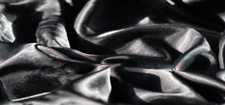 Blur of silky black fabric showing its glossy surface with folds and ripples. The highlights and deep shadows create a visually captivating composition, adding depth and sophistication to the image
