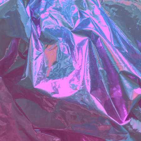 Holographic real texture in trendy colors with scratches and irregularities. Holographic color wrinkled foil. Holographic rainbow foil abstract background. 80s, 90s background.