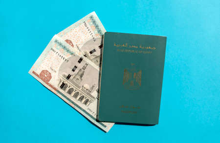 Arab Republic of Egypt passport with egyptian currency pound isolated on blue background. Egyptian passport with national currency. Top view