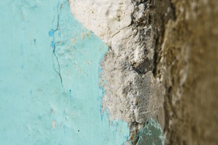Peeling Blue Aquamarine Color Paint from Outer Corner of the Wall. Shattered Plaster Background. Abstract Blurry Backdrop